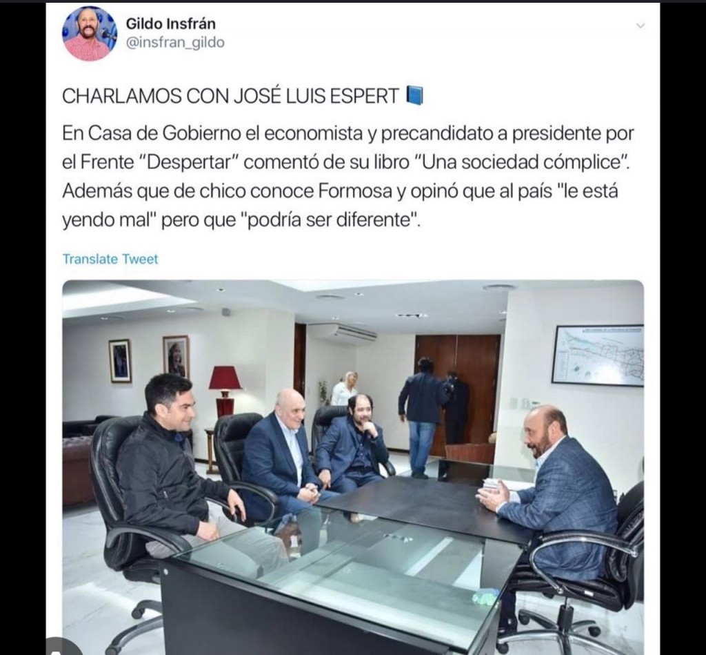 Sí los cuestionamientos al accionar de la campaña Presidencial del 2019 de Espert, tienen por detrás "la mano invisible del Kirchnerismo", es al menos llamativo que no se haga mención, que dentro de aquel afamado raid electoral, hoy desmenuzado al detalle, existió una reunión (cuya gráfica se acompaña) entre el entonces pre candidato presidencial y el gobernador de Formosa en la casa de gobierno de dicha provincia.